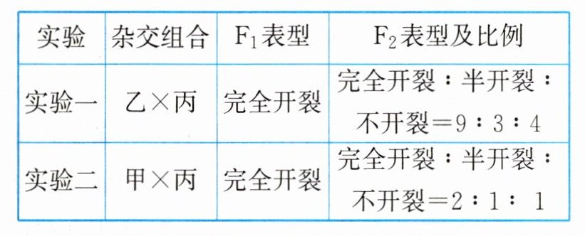 D. 若甲和乙杂交,F₂表型及比例为完全开裂:不开裂=9:7
