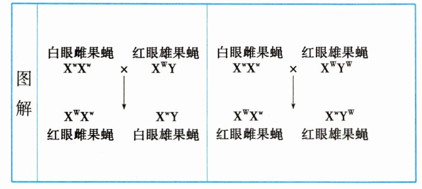 为了验证假说,摩尔根设计了多个新的实验,其中有一组实验最为关键,即白眼雌果蝇与野生型红眼雄果蝇交配,最后实验的真实结果和预期完全符合,假说1得到了证实。利用上述的假说1和假说2,绘出的“白眼雌果蝇与亲本红眼雄果蝇交配”实验的遗传图解如表所示。