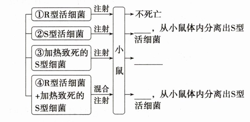 (3)R型细菌无致病性,S型细菌有致病性 加热致死的S型细菌无致病性 R型活细菌能转化为S型细菌