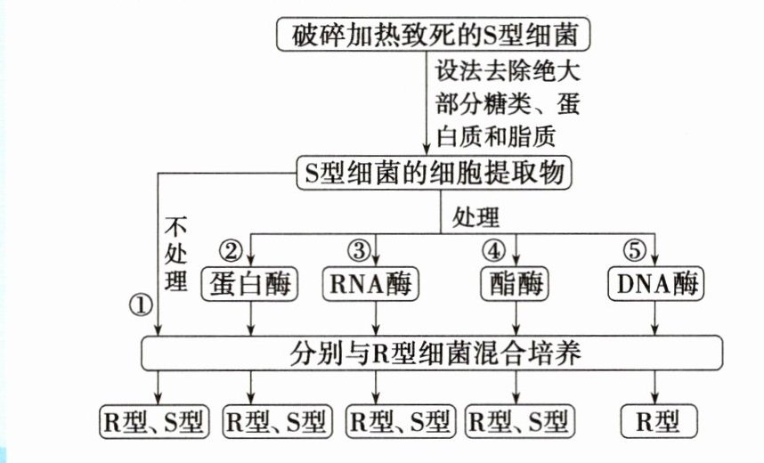 (2)S型细菌的细胞提取物可以促进R型细菌转化为S型细菌 S型菌的细胞提取物用蛋白酶、酯酶或RNA酶处理后仍然具有转化活性 S型细菌的细胞提取物经DNA酶处理后失去转化活性