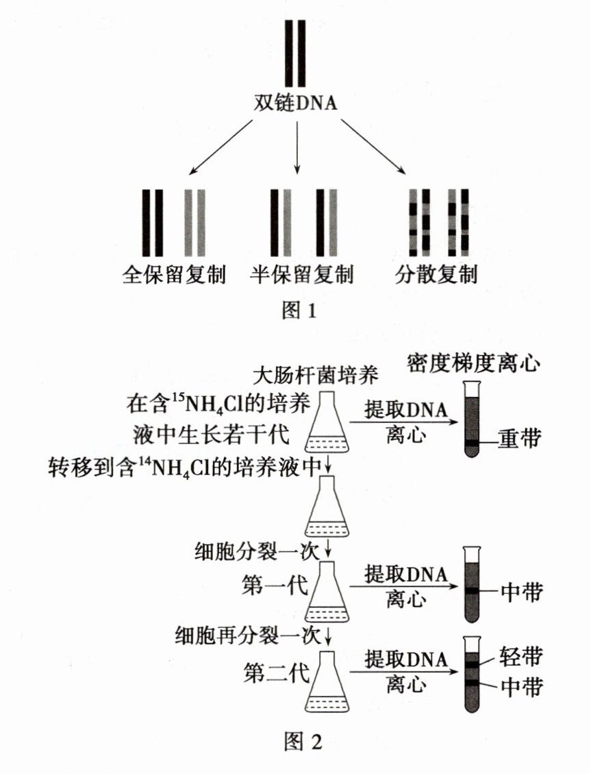1. (2022·海南卷)科学家曾提出DNA复制方式的三种假说:全保留复制、半保留复制和分散复制(图1)。对此假说,科学家以大肠杆菌为实验材料,进行了如下实验(图2):