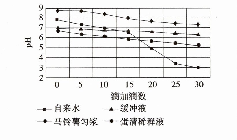 A 解析:自来水组结果呈下降趋势,滴入的应该是酸性物质,若加入0.1 mol/L的NaOH,实验结果与题图不同,自来水组应该随滴数增加呈碱性,pH升高,A错误;由题图可知,两种生物材料维持pH的能力与缓冲液差不多,说明两种生物材料均表现出一定的维持pH稳定的能力,据结果推测生物体可能通过缓冲物质维持pH的稳定,B、C正确;酶正常发挥催化作用需要适宜的pH,pH过高或过低都会影响酶的活性,甚至使酶失活,D正确。