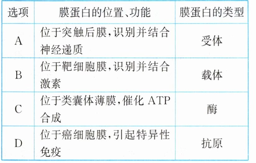 B 解析:膜蛋白的功能多种多样,位于突触后膜上的受体可识别并结合神经递质;位于靶细胞膜上的受体可以识别并结合激素;位于类囊体薄膜上的酶可以催化ATP的合成;位于癌细胞膜上的抗原可以引发机体产生特异性免疫。
