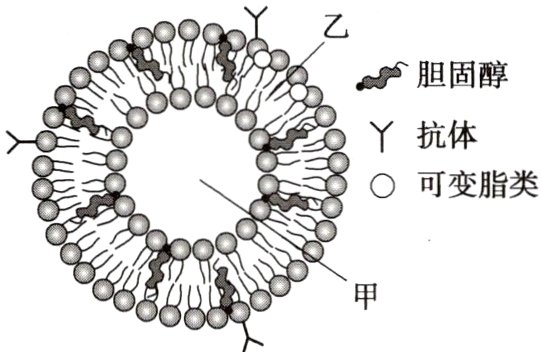 (1)提示 甲处、乙处;两层磷脂分子之间是疏水的,脂溶性药物能被稳定地包裹在其中;脂质体内部是水溶液,能在水中结晶的药物能被稳定地包裹在其中。