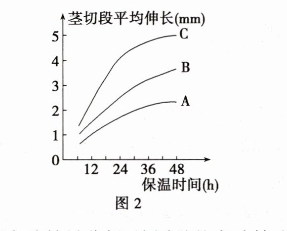 (2)实验中要注意控制无关变量,因此豌豆的生长状况应相同,且切取的部位和长度应相同,并放在相同且适宜的条件下进行培养。要研究“赤霉素对豌豆茎节间切段生长的作用也具有在浓度较低时促进生长、在浓度过高时抑制生长”的假说,因此实验设计思路为配制一系列浓度梯度的赤霉素溶液,分别用清水和所配制的赤霉素溶液处理长度和生长状况相同的豌豆茎节间切段,在相同且适宜条件下培养一段时间,观测并计算每组茎节间切段的平均长度。若该假说成立,则预期实验结果是较低浓度赤霉素溶液处理组茎节间切段的平均长度比清水组的长,较高浓度赤霉素溶液处理组茎节间切段的平均长度比清水组的短。