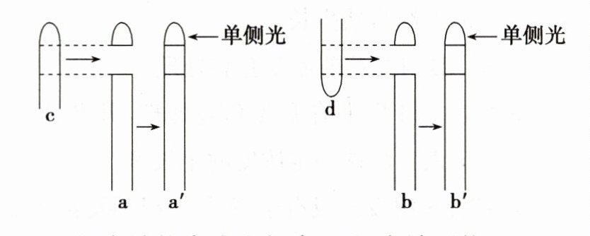 2.取生长状态一致的燕麦胚芽鞘,分为a、b、c、d 四组,将a、b两组胚芽鞘尖端下方的一段切除,再从c、d两组胚芽鞘中的相应位置分别切取等长的一段,并按图中所示分别接人a、b两组胚芽鞘被切除的位置,得到a'、b'两组胚芽鞘。然后用单侧光照射,发现a'组胚芽鞘向光弯曲生长,b'组胚芽鞘无弯曲生长,其原因是()
