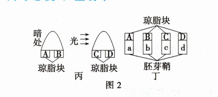 A 解析:图1中,若单侧光将生长素分解了,则甲组和乙组的胚芽鞘都应向光弯曲生长,但乙组胚芽鞘直立生长,说明单侧光没有将生长素分解,而是盖玻片阻止了生长素的横向运输,生长素均匀分布,使胚芽鞘直立生长,A错误;由图2可知,如果胚芽鞘的长度关系为c<a=b=d,则说明单侧光使胚芽鞘尖端向光侧生长素分解了,B正确;如果胚芽鞘的长度关系为c<a=b<d,则说明单侧光使胚芽鞘尖端的生长素发生了转移,C正确;由整个实验可知,胚芽鞘尖端产生的生长素对胚芽鞘的弯曲生长起关键作用,D正确。