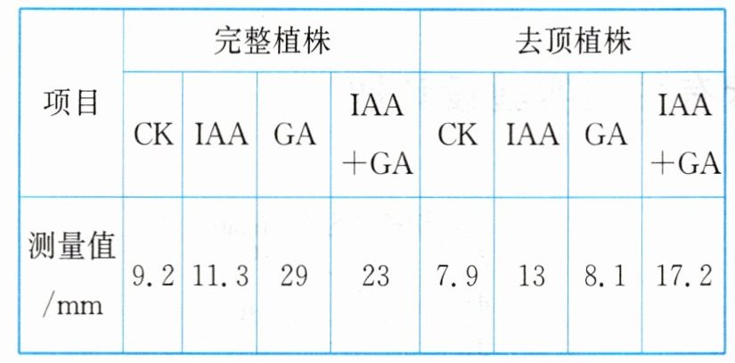 7.为探究生长素(IAA)和赤霉素(GA)对豌豆幼苗伸长的影响,某生物兴趣小组用生长素和赤霉素处理豌豆幼苗的完整植株和去顶植株,实验测得不同条件下幼苗伸长的长度如下表所示。下列分析不正确的是()