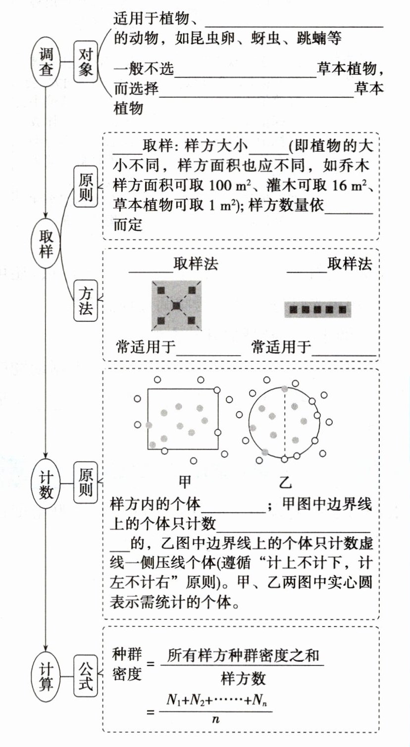 (2)活动范围小和活动能力弱 丛生或蔓生的单子叶;个体数目易于辨别的双子叶 随机 适中 总面积 五点 方形地块 等距 狭长地块 全部计数 样方相邻两边及其顶角上 大 强 $\frac{M\times n}{m}$ 趋光性