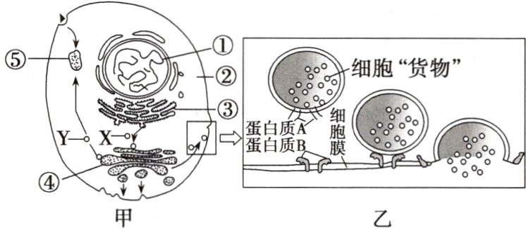 (1)研究表明,图甲中的Y囊泡内的“货物”为多种水解酶,这些酶会储存在结构⑤中,推断结构⑤是什么?由内质网、高尔基体加工的蛋白质一定是分泌蛋白吗?