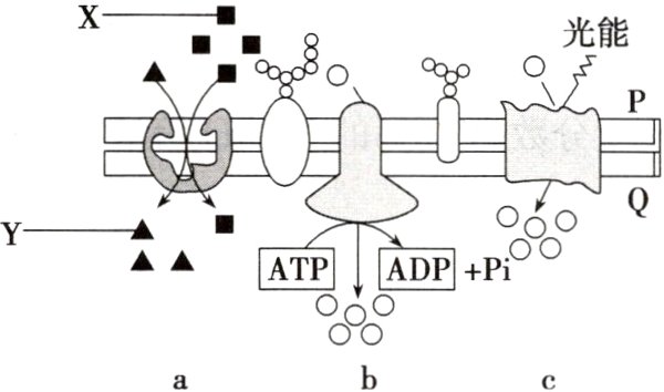B 解析:由于图中P侧有糖蛋白,所以属于膜外侧的是P侧,A正确;X物质是顺浓度梯度运输,属于协助扩散,Y物质是由低浓度向高浓度一侧运输,应属于主动运输,Y与X通过同一个载体运输,可知Y转运所需的能量来源于X通过载体蛋白顺浓度梯度运输产生的势能,B错误;b方式是消耗ATP的主动运输,消耗的ATP来自呼吸作用,而呼吸作用发生的场所是细胞质基质和线粒体,C正确;蓝细菌含有叶绿素和藻蓝素,可以进行光合作用,有可能存在c类型的主动运输,D正确。