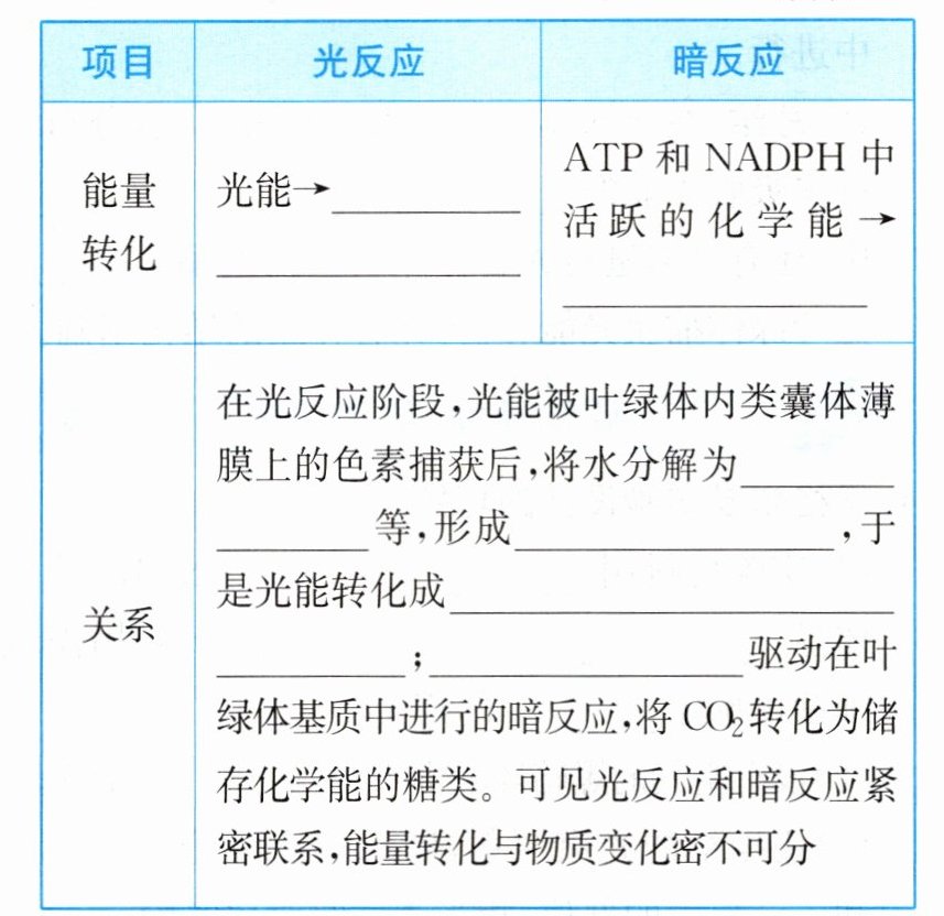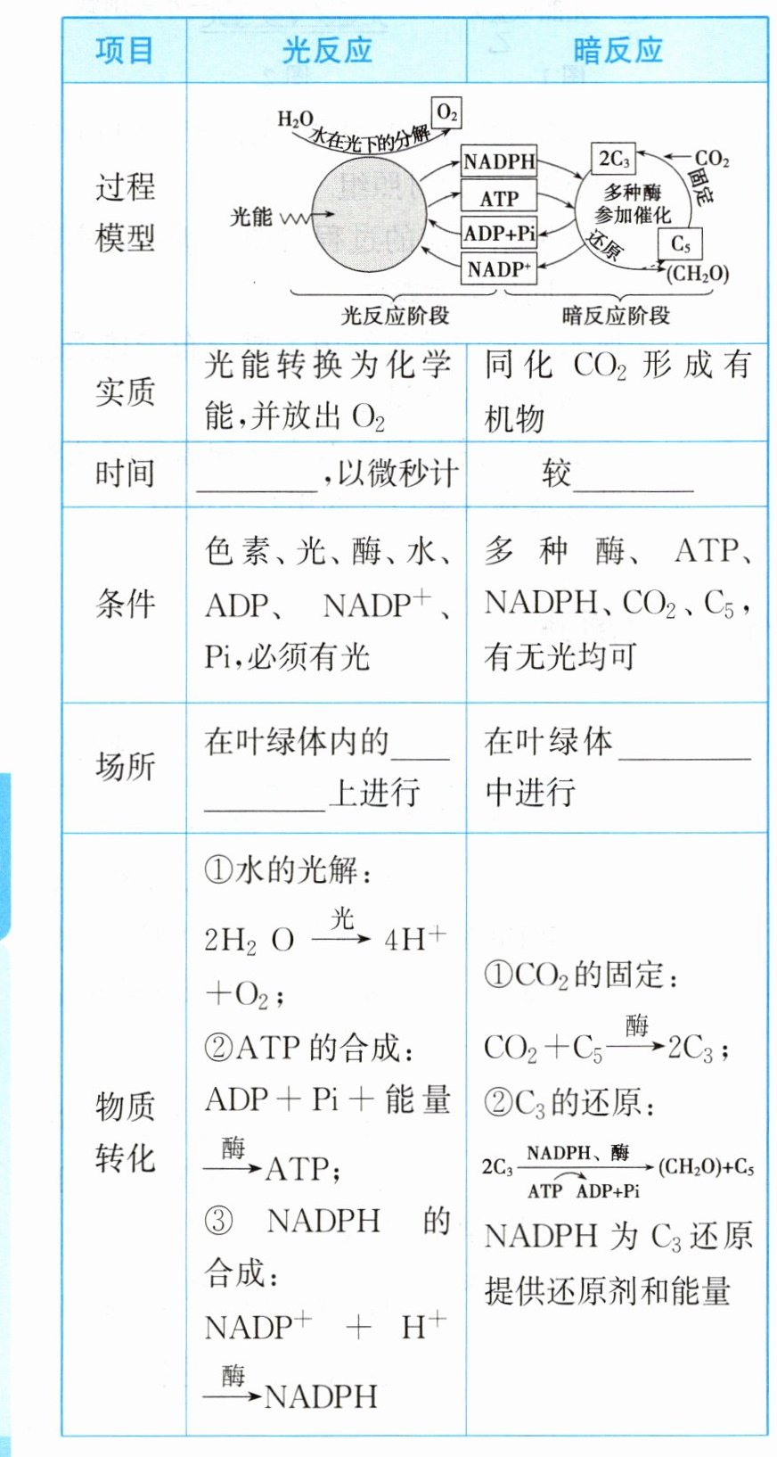 短促 缓慢 类囊体薄膜 基质 ATP和NADPH中活跃的化学能 有机物中稳定的化学能 O₂和H⁺ ATP和NADPH ATP NADPH中的化学能 ATP和NADPH