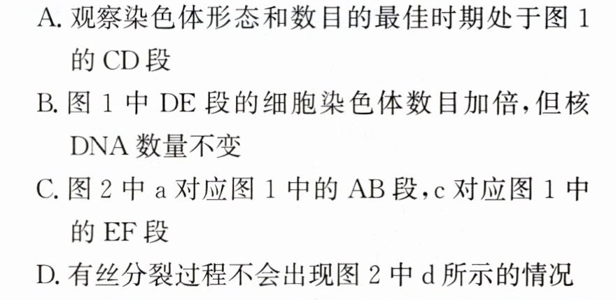 C 解析:图2中a表示有丝分裂后期、末期,对应图1中的EF段,c表示G₁期,对应图1中的AB段,C错误。