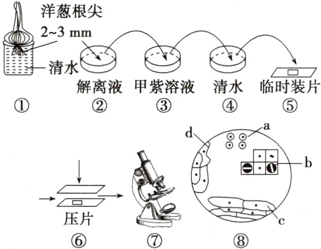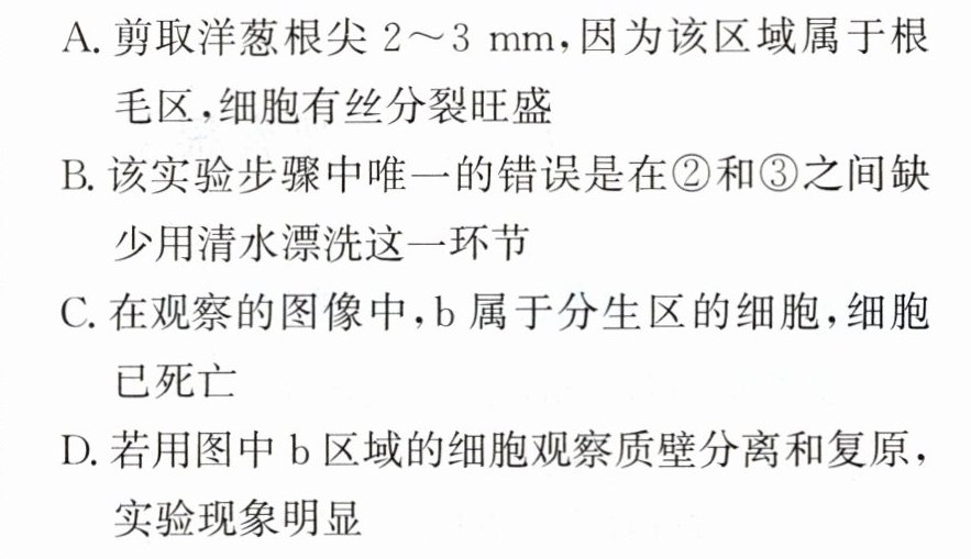 C 解析:洋葱根尖2~3 mm的区域属于分生区,A错误;在②和③之间应增加清水漂洗这一环节,而在③和⑤之间的清水漂洗环节应删除,B错误;分生区的细胞呈正方形,排列紧密,细胞经解离已死亡,C正确;b区域的细胞属于分生区细胞,其液泡较小,渗透作用不明显,若用于观察质壁分离与复原,现象不明显,D错误。