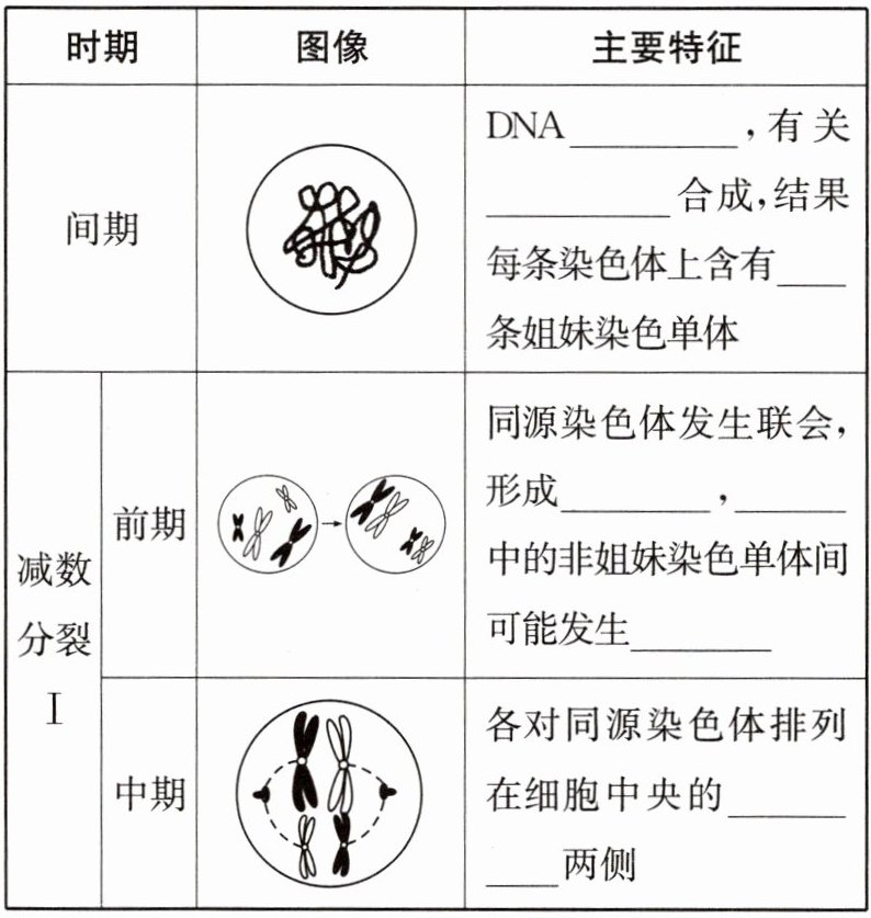 复制 蛋白质 2 四分体 四分体 互换 赤道板 彼此分离 自由组合 减半 分裂 染色体 加倍 一半