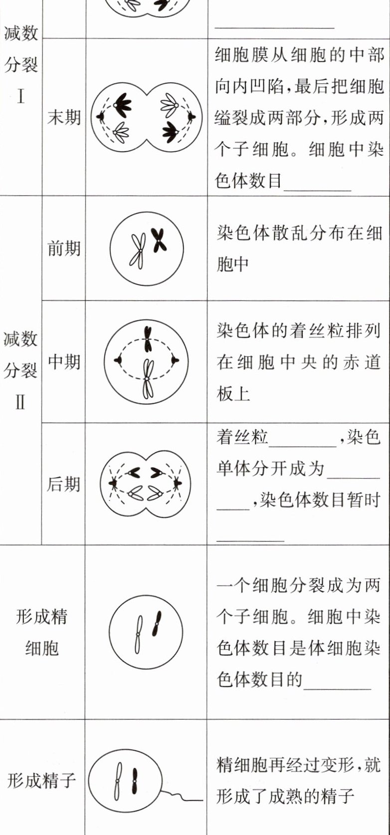 2. 过程:在减数分裂前,每个精原细胞的染色体复制____次,而细胞在减数分裂过程中连续分裂____次,最后形成____个精细胞。这两次分裂分别叫作____(也叫减数第一次分裂)和____(也叫减数第二次分裂)。