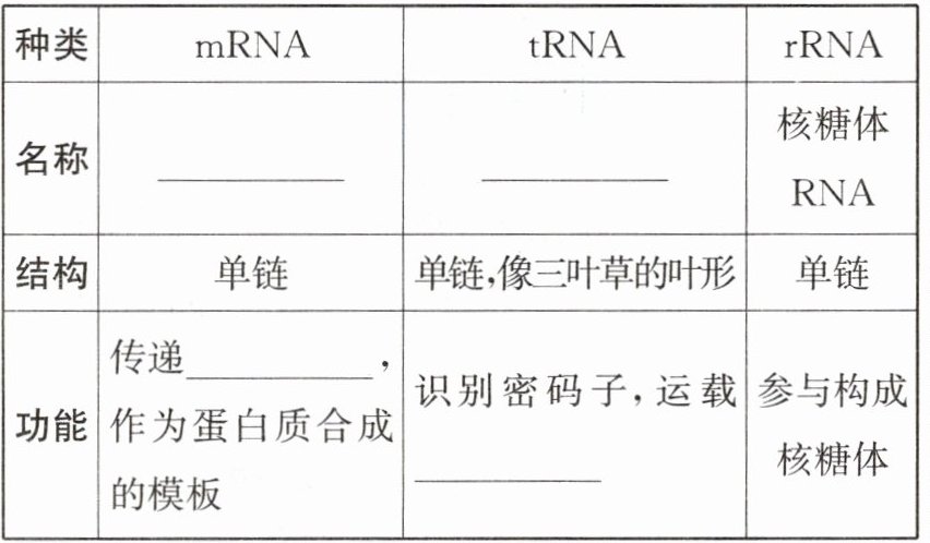 |功能|传递遗传信息,作为蛋白质合成的模板|识别密码子,运载氨基酸|参与构成核糖体|