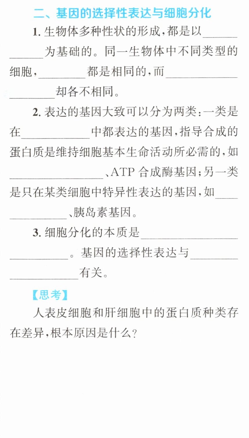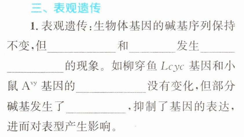 1.基因表达 表型 可遗传变化 碱基序列 甲基化修饰 2.生长、发育和衰老