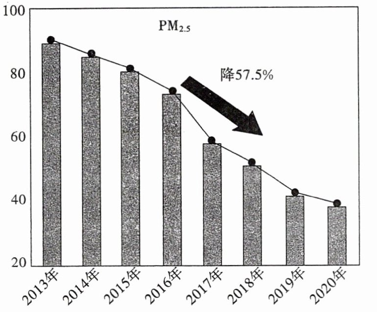 PM2.5是指直径在2.5μm以下的颗粒物,能长时间悬浮在空气中。PM2.5在空气中的含量越高,代表空气污染越严重。下图示意北京市2013−2020年空气中PM2.5指数变化。读图,完成7~8题。