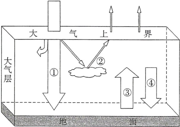(2024.湖南娄底市质检)2024年2月16日,中央气象台寒潮、大风、沙尘暴三预警齐发,其中有沙尘暴蓝色预警。新疆东部和南疆盆地、内蒙古中西部等地出现沙尘暴。2月19日,北方部分地区及四川、湖北等地也出现大风沙尘天气。下图为大气受热过程示意图。