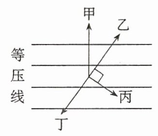 3.A 图中甲箭头与等压线垂直,应表示水平气压梯度力;图中乙箭头指向与水平气压梯度力有一个锐角夹角,与等压线斜交,应表示风向;图中丙箭头与风向(乙箭头)垂直,并位于风向的右侧,应表示北半球的地转偏向力;图中丁箭头与风向(乙箭头)相反,应表示摩擦力。故选A。