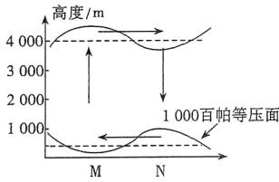 (1)读图可知,近地面M处等压面下凹,为低压,N处等压面上凸,为高压;上空和近地面的气压状况相反,因此M处上空等压面上凸,N处上空等压面下凹,作图即可。M处近地面为低压,盛行上升气流,N处近地面为高压,盛行下沉气流;水平方向气流由高压吹向低压,近地面由N吹向M,高空由M吹向N,因此形成顺时针方向的热力环流。
