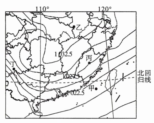 (1)丁 理由:等压线越密集,水平气压梯度力越大,风力越大。