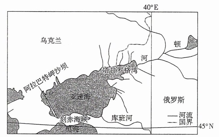 (2024.山东青岛市期末)亚速海是东欧的一个陆间海,平均深度只有8m,是世界上最浅的海,南部通过刻赤海峡与黑海相通,下图示意亚速海位置。读图,完成7~8题。