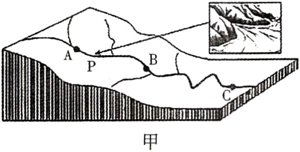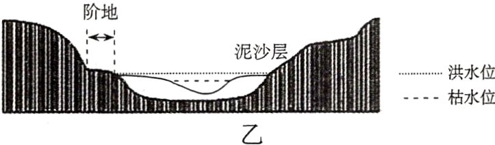 (2)由图乙可知,此地河道周围泥沙沉积较多,其形成原因应当是河流的流速降低,搬运作用减弱,堆积作用增强,这种现象主要发生于河流下游平原地区,图中只有C地位于下游平原地区,故选C。