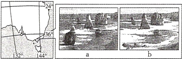 (2)图b中最左侧的石柱已成碎石,原因是海浪侵蚀作用。
