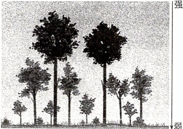 2.B 读图可知,分布在最底层的植被被高层植被遮挡,所获取的阳光较少,故为喜阴特性,不一定喜水和喜旱。故选B。