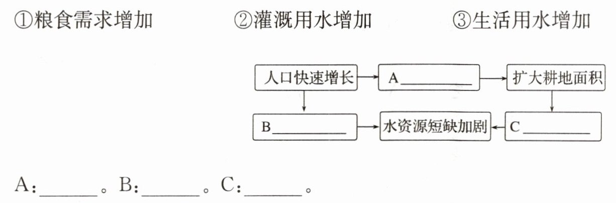 (2)请将下列内容的序号填入对应的空格内,完成“中亚人口快速增长与水资源短缺加剧关系”的框图。
