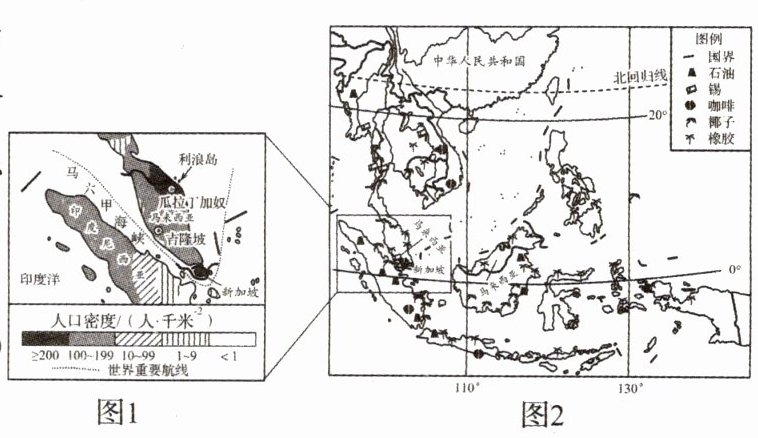 小明家住在北京,妈妈准备在寒假期间带小明去马来西亚吉隆坡、利浪岛等地旅行,出行前小明和妈妈一起做攻略。图1为马来西亚简图,图2为东南亚位置、物产信息图。读图,完成1~4题。