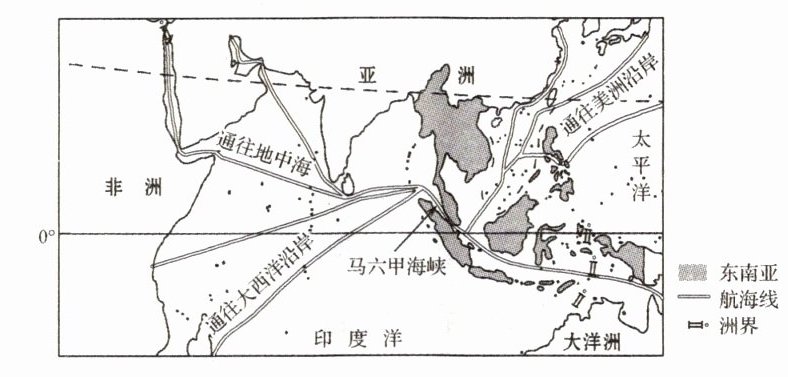 (3)东南亚地处亚洲与大洋洲、太平洋与印度洋之间的“十字路口”,是世界海洋运输和航空运输的重要枢纽,其中马六甲海峡是连接太平洋和印度洋的咽喉要道,被称为“海上生命线”。