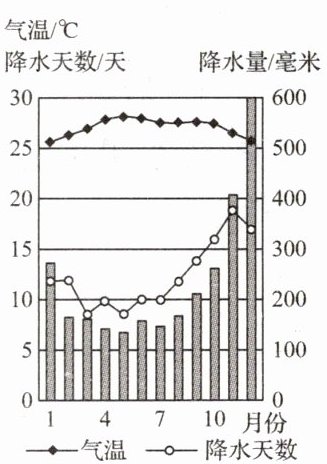 (1)东南亚全年鲜果不断,主要得益于当地优越的气候条件。右图为东南亚热带水果主产区的多年平均各月气温曲线与降水量柱状图,据图描述该气候的特征。