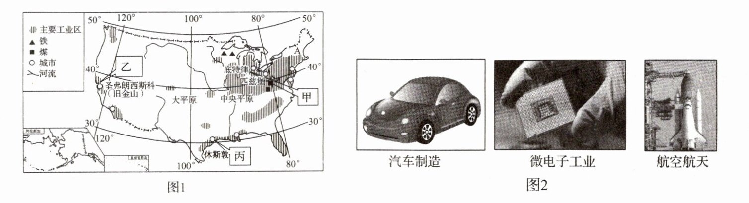 汽车制造主要位于甲地,即东北部工业区的底特律;微电子工业主要位于乙地,即西部工业区的圣弗朗西斯科(旧金山);航空航天主要位于丙地,即南部工业区的休斯敦。