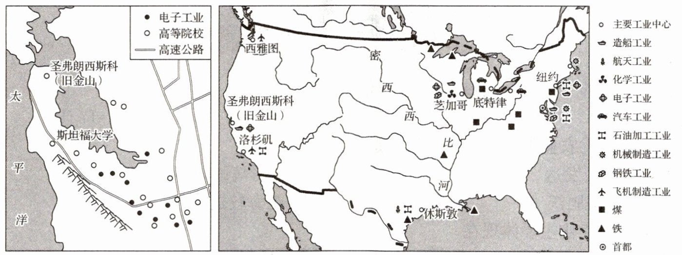 (2024·广州期末)读美国“硅谷”及周边地区示意图和美国本土工业分布图,完成1~2题。