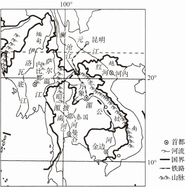 【地理与时事】中老铁路是中国、老挝两国互利合作的旗舰项目和高质量共建“一带一路”的标志性工程。2024年春节期间(2月10日至17日),昆明海关共监管验放经中老铁路进出口的货运量达13万吨、货值3.45亿元。右图示意中老铁路位置。据此完成1~3题。