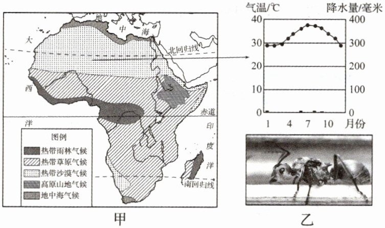 (2024·广东学业考)银蚁生活在非洲撒哈拉沙漠,其生存绝技是能以0.855米/秒的速度在高温天气出巢觅食,被称为“快银”。图甲为非洲气候类型分布图,图乙为银蚁分布地区气候资料及银蚁外观图。据此完成1~3题。