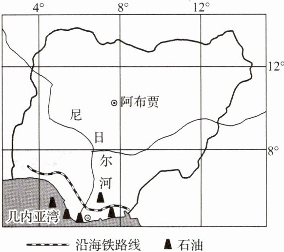 尼日利亚是非洲第一大石油出口国,经济以农矿业为主,交通建设对其经济发展尤为重要。尼日利亚南部的沿海铁路由中国援建,全线采用了中国铁路技术标准。如图为尼日利亚简图。读图,完成3~4题。