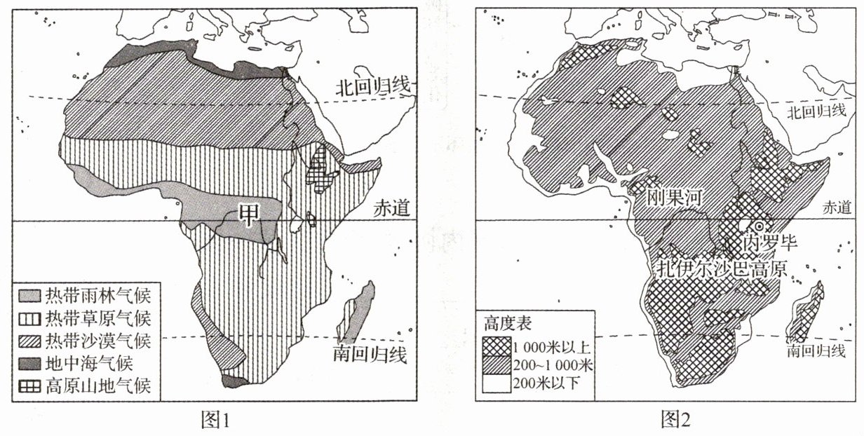 2024年5月9日,中国—非洲投资贸易促进合作交流会在肯尼亚首都内罗毕举行,中非双方迎来了新的合作机遇,中肯旅游界的交流与合作进一步加强。图1为非洲气候类型分布图,图2为非洲地形图。