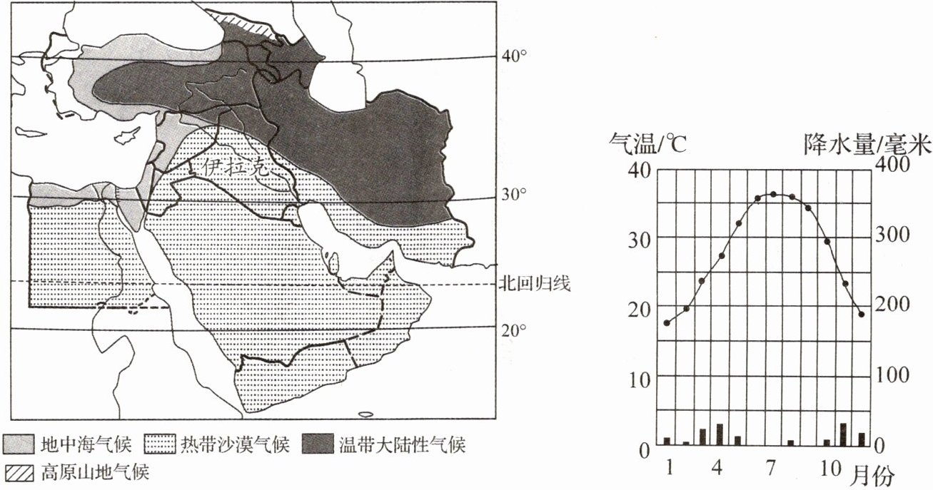 “油比水贵”是众所周知的生活常识。但是,大千世界,无奇不有,世界上有一个地方“水比油贵”,它就是中东地区。下图为中东气候类型图及麦地那气候资料图。