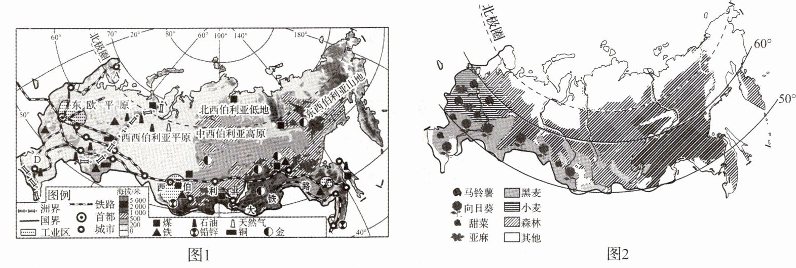 俄罗斯油气资源丰富,长期以来,俄罗斯依靠大量出口石油、天然气,促进了本国经济的较快增长。但是,过度依靠石油、天然气等资源的出口,导致经济发展不够持续稳定。为此,俄罗斯已将制造业、高新技术领域作为国家经济新的发展方向。图1为俄罗斯地形、矿产、工业区分布图,图2为俄罗斯农业分布图。