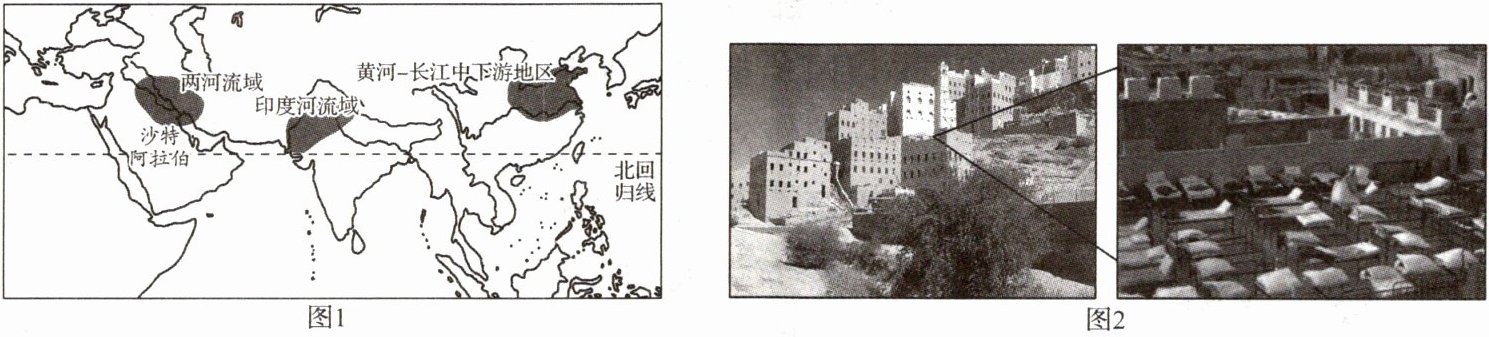 材料三 图1为亚洲文明古国地理位置示意图,图2为沙特阿拉伯典型民居及屋顶酒店景观图。