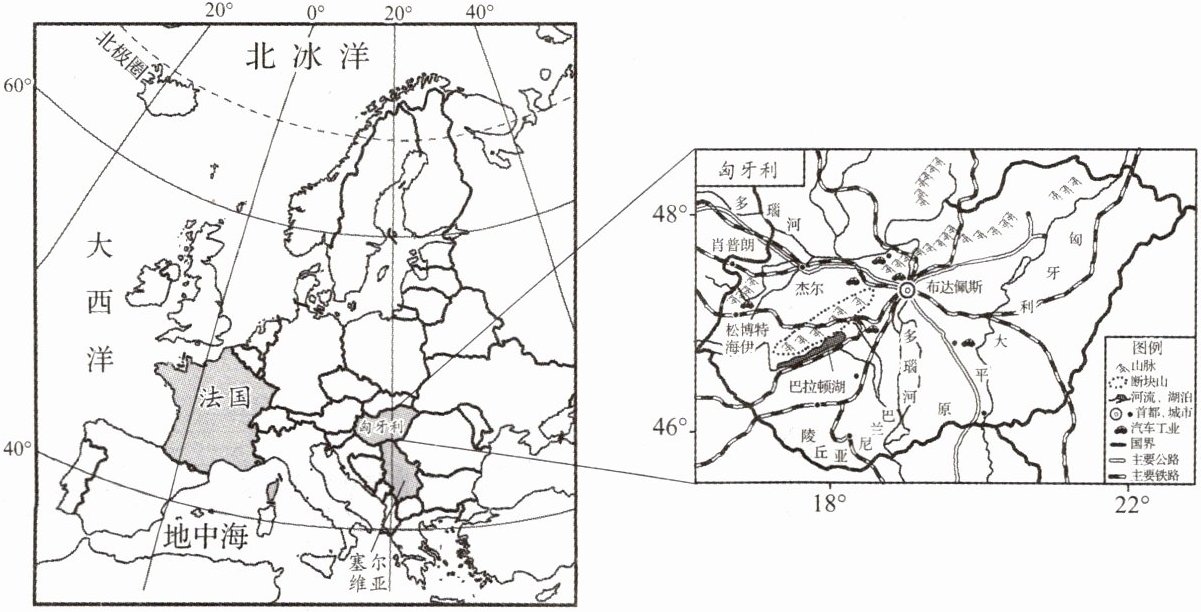 2024年5月5日至10日,习近平应邀对法国、塞尔维亚和匈牙利三国进行国事访问。匈牙利是欧盟中首个加入“一带一路”倡议及中东欧第一个建立人民币支付清算体系的国家,中国某企业把面向欧盟市场的高端新能源巴士生产基地建在匈牙利,给两国都带来良好收益。下面左图为法国、塞尔维亚和匈牙利位置示意图,右图为匈牙利简图。据此完成1~3题。