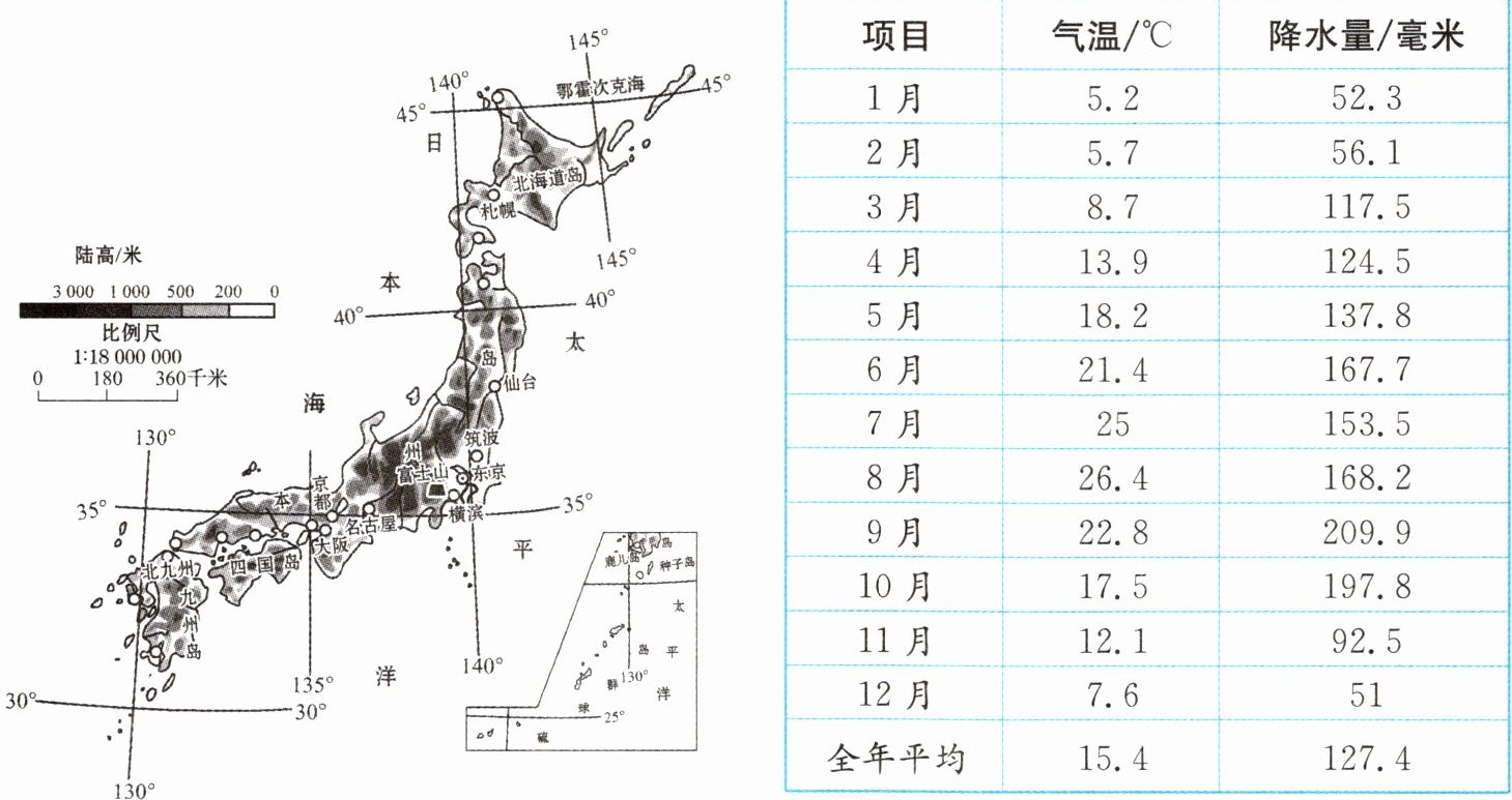 7.【学科素养·综合思维】“日本制造”凭借其优越的产品性能和可靠的产品质量而长期享誉全球,但日本的农业在经济中占比较低。读日本地形图、日本气候资料表以及日本工业产品、原材料生产与进出口状况图,回答下列问题。