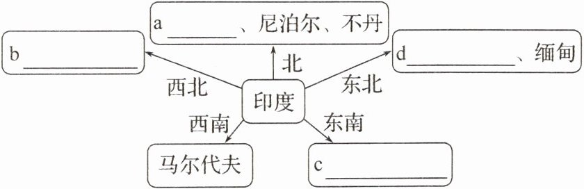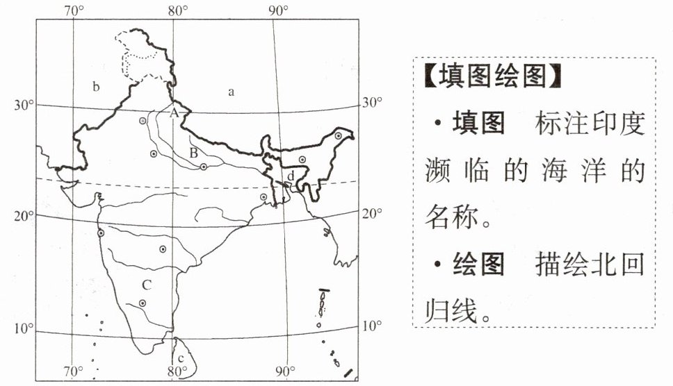 (1)喜马拉雅 (2)热 亚热 (3)南部 孟加拉湾 阿拉伯海 印度洋;a.中国 b.巴基斯坦 c.斯里兰卡 d.孟加拉国;喜马拉雅 恒河 德干