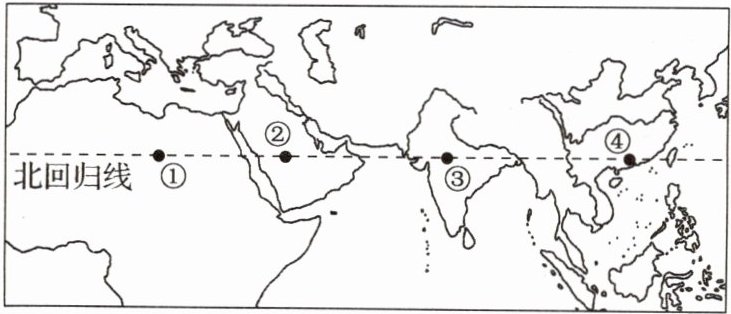 读北回归线穿过的世界部分地区图,完成1~2题。