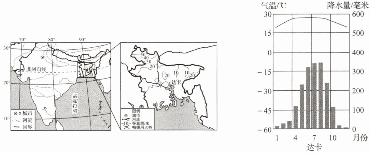 帕德玛大桥位于孟加拉国首都达卡西南约40千米处,该桥由中国承建,被当地人誉为“梦想之桥”。下图是孟加拉国略图和达卡气候资料图。读图,完成8~10题。