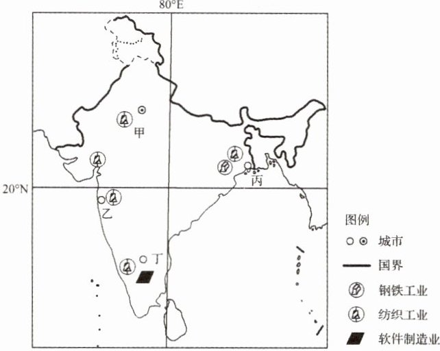 20世纪90年代以来,印度的信息技术产业发展迅速。读印度的部分工业分布图,完成1~2题。